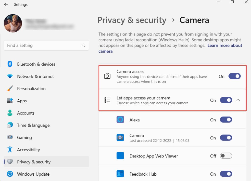 Passaggio 2 –Vai aPrivacy e sicurezza, scorrere verso il basso e fare clic suTelecameraSottoAutorizzazioni dell'app.
