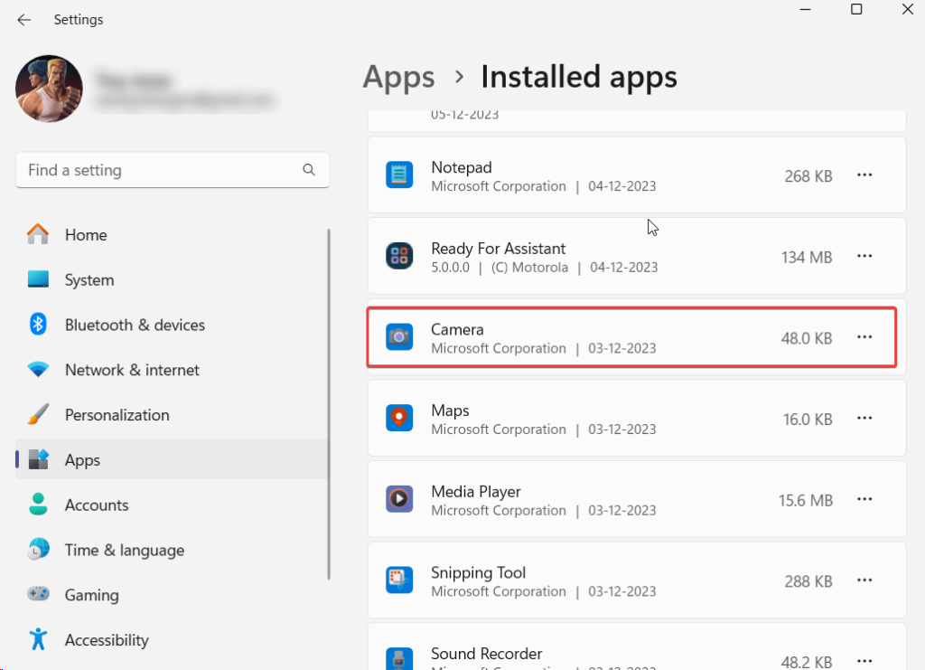 Passaggio 4 –Scorri verso il basso, individuaTelecamera,e fai clic sui tre punti accanto al nome dell'app.