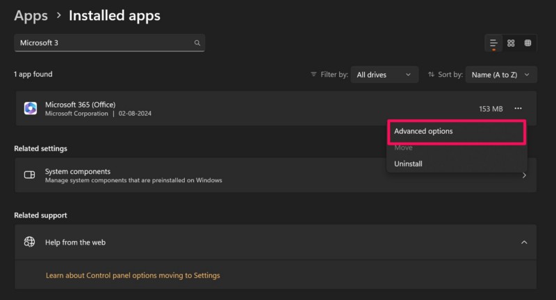 3. Ripara o reimposta l'app Microsoft 365 su Windows 11