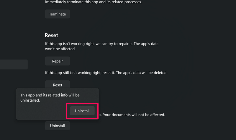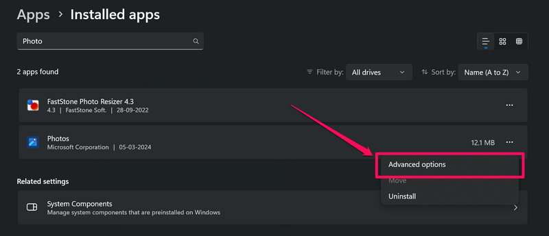 Se il trucco della chiusura forzata non ha risolto il problema di mancato funzionamento della cancellazione generativa nell'app Foto su Windows 11, puoi provare a riparare e/o ripristinare l'app sul tuo PC o laptop. Gli strumenti di riparazione e ripristino sono integrati per le applicazioni di Microsoft Store che consentono agli utenti di risolverli facilmente ed eliminare i problemi in-app.