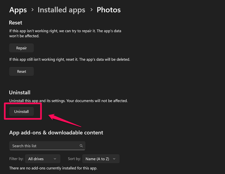 Un'altra cosa che puoi provare a risolvere il problema di mancato funzionamento della cancellazione generativa nell'app Foto è disinstallare l'app dal tuo PC o laptop Windows 11 e reinstallarla. Ciò eliminerà tutti i dati dell'app dal tuo dispositivo e installerà nuovamente l'app Foto.
