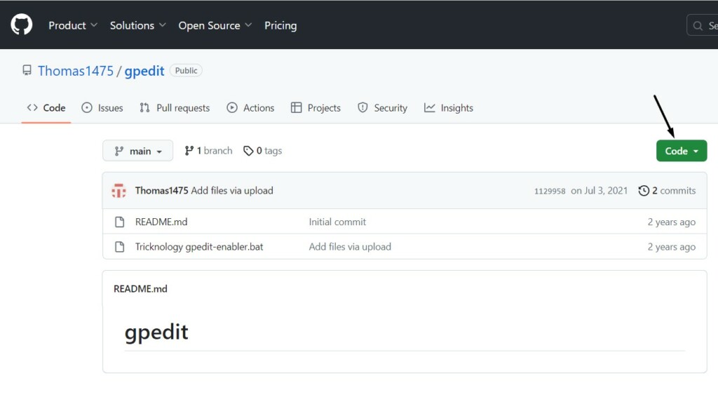 1.ClicQuiper andare al Pagina GitHub dell'Editor criteri di gruppo e fare clic suCodicepulsante su di esso.