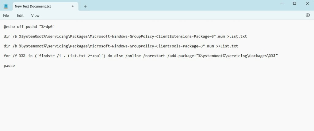 dir /b %SystemRoot%servicingPackagesMicrosoft-Windows-GroupPolicy-ClientExtensions-Package~3*.mum >List.txt