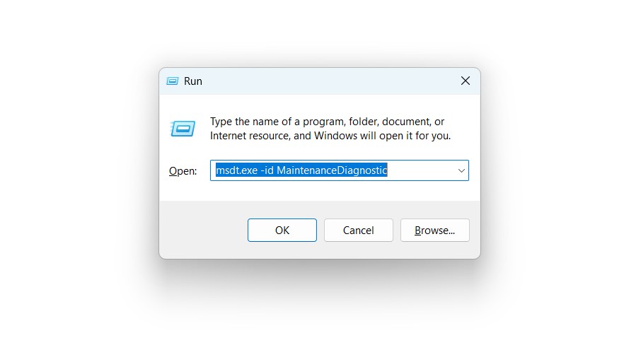 2.Digita msdt.exe -id MaintenanceDiagnostic al suo interno per aprire il fileManutenzione del sistemastrumento di risoluzione dei problemi.