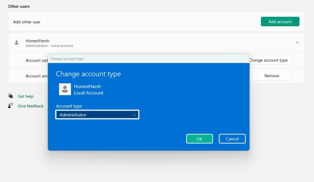 8.ClicCambia tipo di accountaccanto ad esso e quindi selezionareAmministratoreopzione dal menu a discesa.