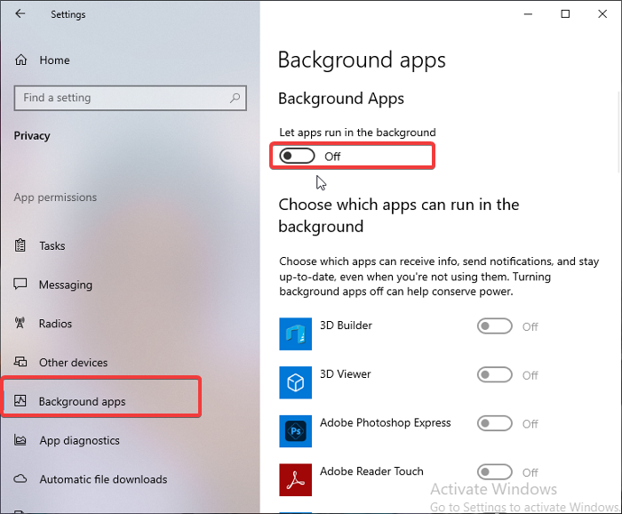 3.Quindi disattiva l'opzione che leggeConsenti l'esecuzione delle app in background.