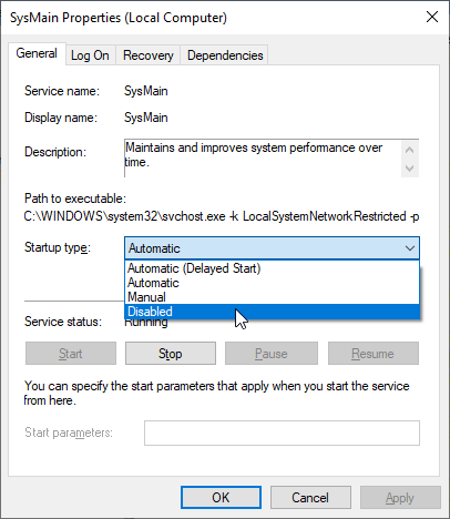 5.Successivamente, seleziona ilTipo di avvionella finestra Proprietà SysMain e cambiarlo inDisabilitato.