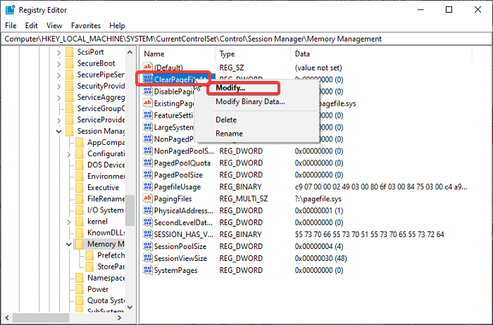 4.Nella cartella Gestione memoria, fare clic con il pulsante destro del mouseClearPageFileAtShutdowne selezionaModificare.