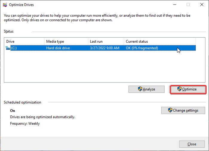3.Fare clic sui dischi rigidi che si desidera deframmentare e premereOttimizzarenella parte inferiore dello schermo.