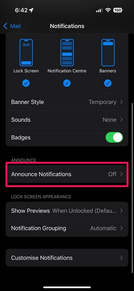 7.Se vuoi che Siri annunci le tue email in arrivo, puoi farloaccendereILAnnunciare le notificheopzione.
