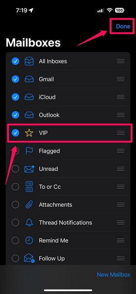 3.Ora,individuare l'opzione VIPnella sezione Cassette postali. Se non riesci a trovare l'opzione VIP elencata sotto Cassette postali, toccaModificarepulsante in alto a destra.