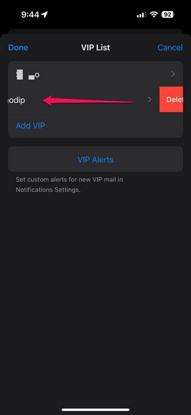 9.Se lo desiderieliminare un contattodalla lista VIP,scorri verso sinistraper rivelare ilEliminarepulsante.