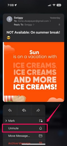 Un altro possibile motivo per cui potresti non ricevere le notifiche dell'app di posta sul tuo iPhone è se il mittente è disattivato nell'app. L'app Mail consente agli utenti di disattivare l'audio dei mittenti per interrompere la ricezione delle loro notifiche e-mail. Le e-mail inviate da mittenti disattivati vengono visualizzate con un'icona a forma di campana barrata accanto nell'app Mail sul tuo iPhone.