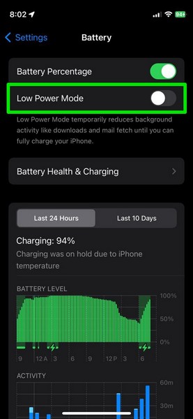Un'altra funzionalità iOS che può causare il mancato funzionamento delle notifiche dell'app Mail sul tuo iPhone è la modalità di risparmio energetico. La modalità di risparmio energetico è progettata per preservare la batteria del tuo dispositivo e, quindi, disabilita temporaneamente varie operazioni in background, incluso il recupero delle e-mail e le notifiche dell'app Mail.
