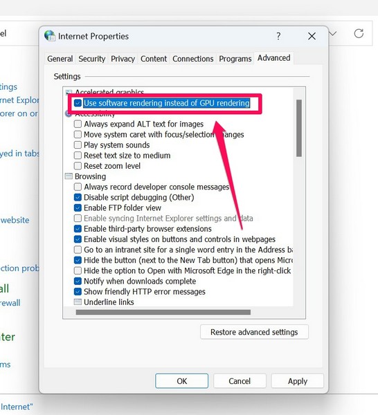 5.Qui,seleziona la casellaperUtilizza il rendering software invece del rendering GPUsotto l'opzione Grafica accelerata.