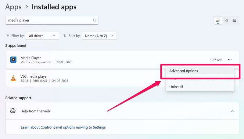 1.Seguirepassaggi 1-4daCorrezione n.4per andare alOpzioni avanzatepagina per ilApplicazione Lettore multimedialein Windows 11.