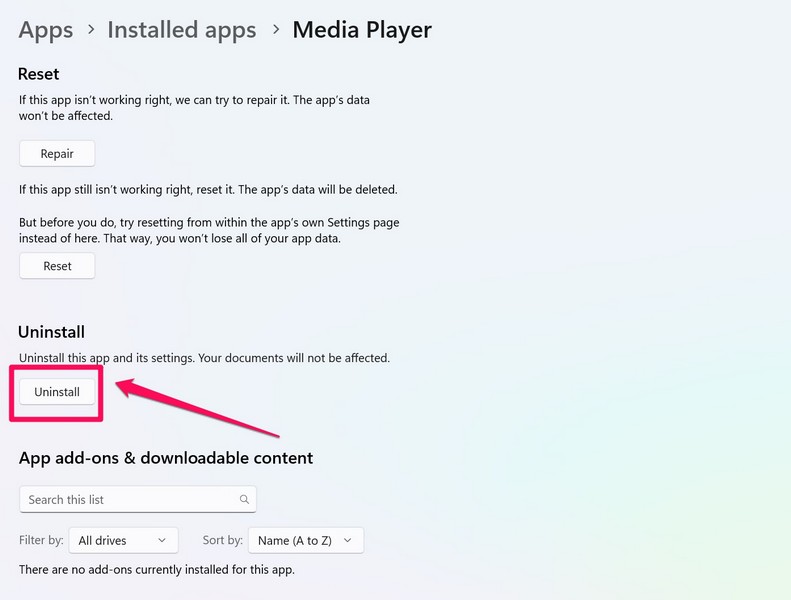 Se l'aggiornamento dell'app Media Player non ha risolto il problema sul tuo PC o laptop Windows 11, la cosa migliore da provare è reinstallare l'app. Disinstallare l'app Media Player sul tuo dispositivo e reinstallarla potrebbe aiutare a risolvere il problema del mancato funzionamento di Media Player in Windows 11. Quindi, segui i passaggi seguenti per farlo.