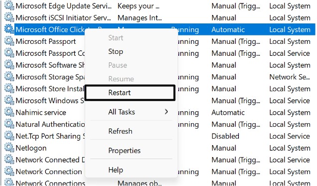 Pertanto, ti suggeriamoriavviarloe verifica se consente a Microsoft Office di aggiornarsi senza bloccarsi. Puoi provare i passaggi indicati per sapere come riavviare questo servizio Microsoft Office: