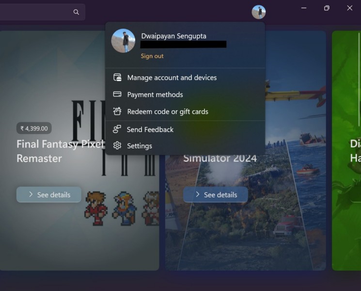 3. Controlla l'account Microsoftcon cui hai attualmente effettuato l'accesso a Microsoft Store.