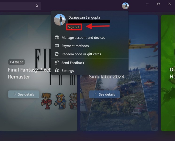 4.Se non corrisponde all'account Microsoft con cui hai acquistato l'app o il gioco, fai clic suPulsante Esciproprio sotto il nome dell'account.