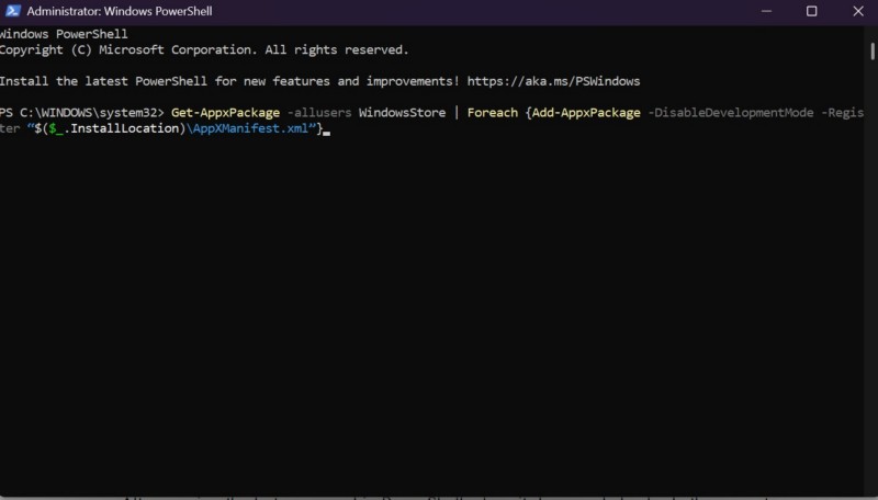 Get-AppxPackage -allusers WindowsStore | Foreach {Add-AppxPackage -DisableDevelopmentMode -Register “$($_.InstallLocation)AppXManifest.xml”}