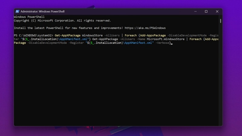 Get-AppXPackage WindowsStore -AllUsers | Foreach {Add-AppxPackage -DisableDevelopmentMode -Register "$($_.InstallLocation)AppXManifest.xml"} Get-AppXPackage -AllUsers -Name Microsoft.WindowsStore | Foreach {Add-AppxPackage -DisableDevelopmentMode -Register "$($_.InstallLocation)AppXManifest.xml" -Verbose}
