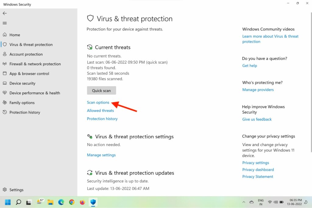 5.Ora, fai clic suOpzioni di scansionesotto Minacce attuali.