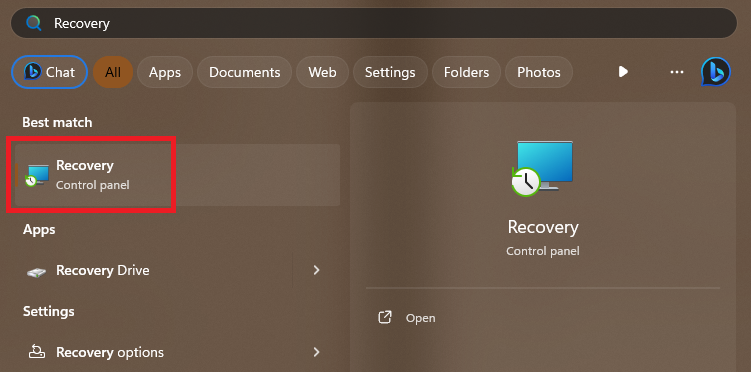 1.Apri la barra di ricerca del menu Start, digitaRecupero,e premere ilEntratasto sulla tastiera.