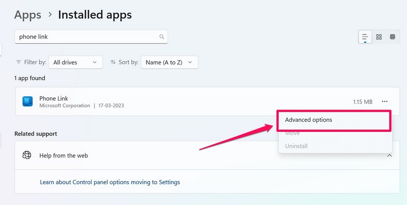 3.Utilizza la barra di ricerca per trovare ilCollegamento telefonicoapp e fare clic supulsante a tre punti.