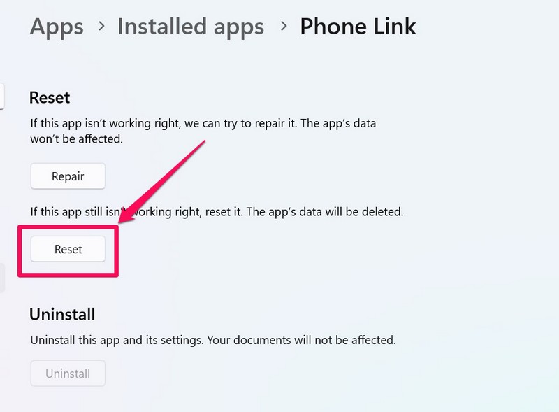 Se la riparazione dell'app Phone Link non ha funzionato, segui i passaggi seguenti per reimpostare l'app sul tuo PC o laptop Windows 11: