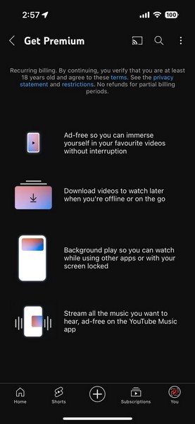 Se hai già YouTube Premium, puoi saltare questo passaggio e dare subito un'occhiata a quelli successivi. Tuttavia, se non sei un membro Premium su YouTube, puoi seguire i passaggi riportati di seguito per iscriverti a uno dei piani a pagamento di YouTube sul tuo dispositivo iOS: