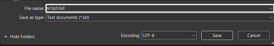 2.Una volta creato il nuovo documento, assegnagli un nomescript.bat, e copia e incolla al suo interno il codice indicato di seguito.