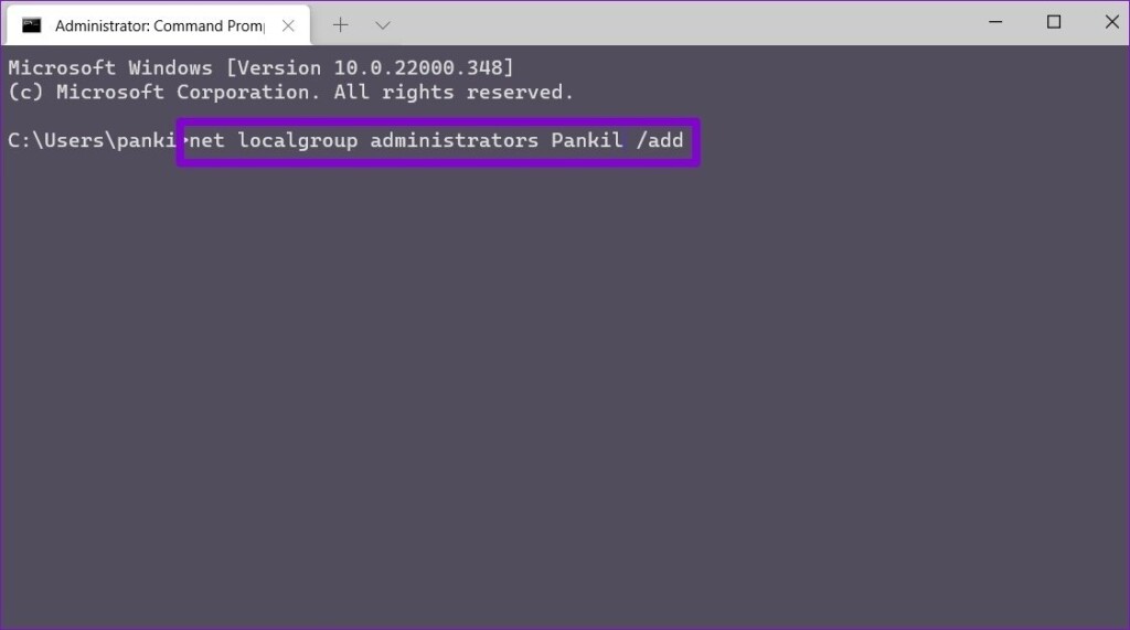 3.Ora devi assegnare i diritti di amministratore del nuovo account utente, in modo da poter eseguire facilmente attività di alto livello. Per fare ciò, esegui il comando indicato di seguito nella console.