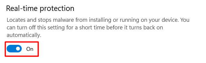 4.Infine, fare clic suAttiva/disattiva la protezione in tempo realeper disattivare lo strumento di rimozione malware di Windows. L'interruttore dovrebbe essere inseritogrigiouna volta disabilitato.