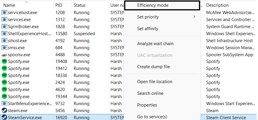 Per questo motivo, non sarà in grado di eseguire determinate attività che potrebbero essere necessarie per il corretto funzionamento. Puoi provaredisabilitando la modalità Efficienzaper l'app Steam seguendo i passaggi indicati: