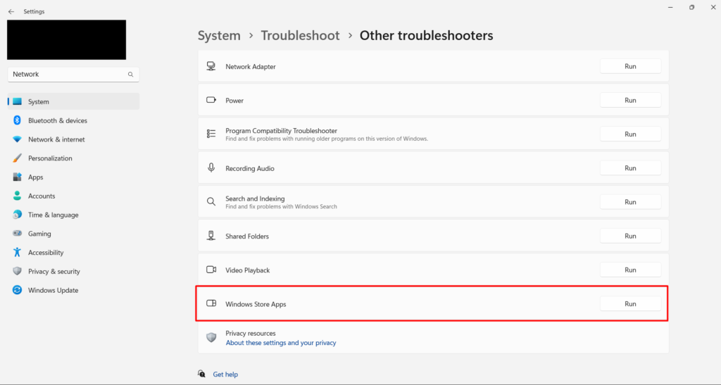 7. Esegui lo strumento di risoluzione dei problemi dell'app di Windows Store