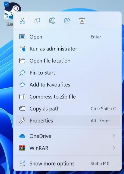 Passaggio 1:SelezionareProprietàfacendo clic con il pulsante destro del mouse sull'icona del collegamento per Steam.