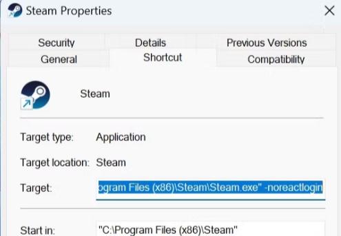 Nota: valuta la possibilità di eliminare eventuali parametri di lancio già presenti nel campo Target. Alcuni utenti di GitHub affermano che Steam non supporta più il flag "noreactlogin" e consigliano di eliminarlo. Se questo flag è già presente, rimuovilo.