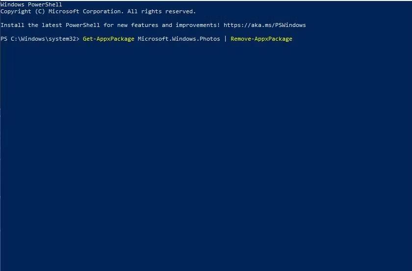 Passaggio 2:Nella finestra di PowerShell, digita il comando seguente e premiEntraper disinstallare l'app Foto: