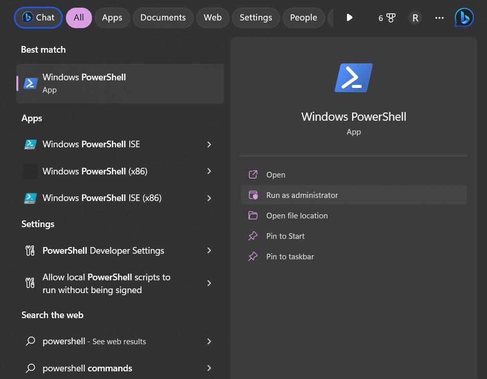 Passaggio 1:Tocca l'icona di ricerca posizionata sulla barra delle applicazioni, digita "PowerShell" nella barra di ricerca, quindi seleziona "Esegui come amministratore"dal menu contestuale. Questo aprirà PowerShell con privilegi di amministratore.