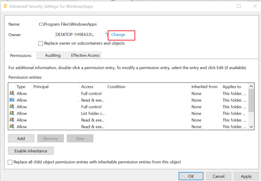 Se riscontri l'errore "L'utente specificato non ha un profilo valido", un'altra potenziale soluzione prevede la modifica della posizione delle cartelle che includono le app interessate. Tuttavia, per fare ciò, dovrai assumere la proprietà della cartella WindowsApps.