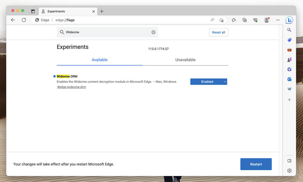 Microsoft Bordo: Tipobordo://flagnella barra degli indirizzi e premereEntra. Nella schermata Esperimenti visualizzata, digitaDRM WidevinenelRicercascatola. Quindi, apri il menu a discesa accanto aDRM Widevinee selezionaPredefinitoOAbilitato.