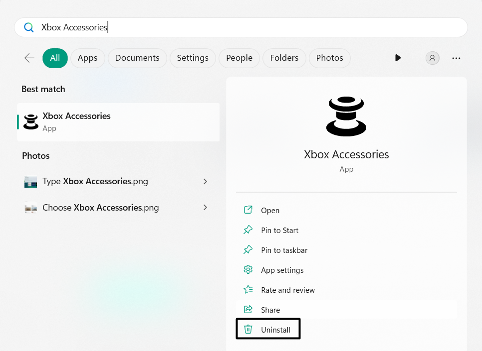 1.Apri ilCasella di ricerca di Windows, digita il nome dell'app e seleziona il fileDisinstallareopzione in esso.