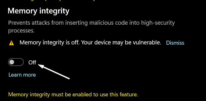7. Disabilitare l'opzione Integrità memoria