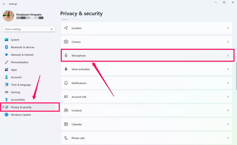 Segui i passaggi riportati di seguito per abilitare l'accesso al microfono per Windows o app di terze parti sul tuo PC o laptop Windows 11 per risolvere il problema del mancato funzionamento del registratore vocale:
