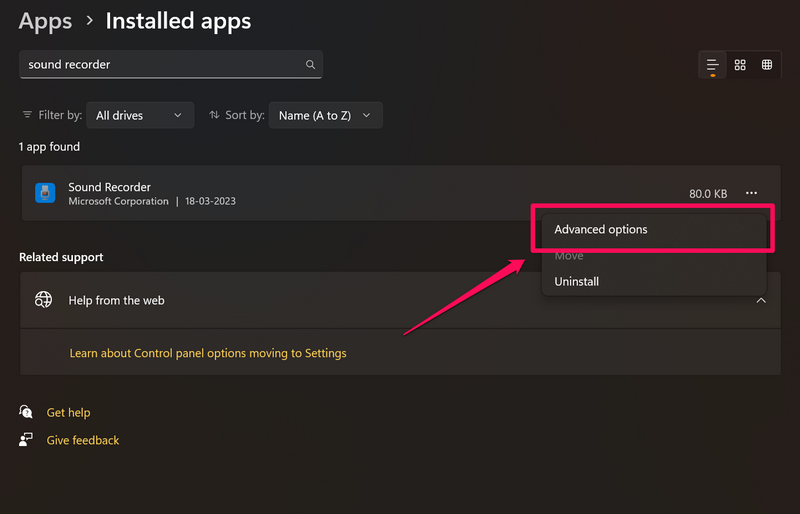 1.Apri ilOpzioni avanzatepagina per l'app Registratore di suoni in Windows 11 come spiegato nella correzione precedente (Correzione n.5).