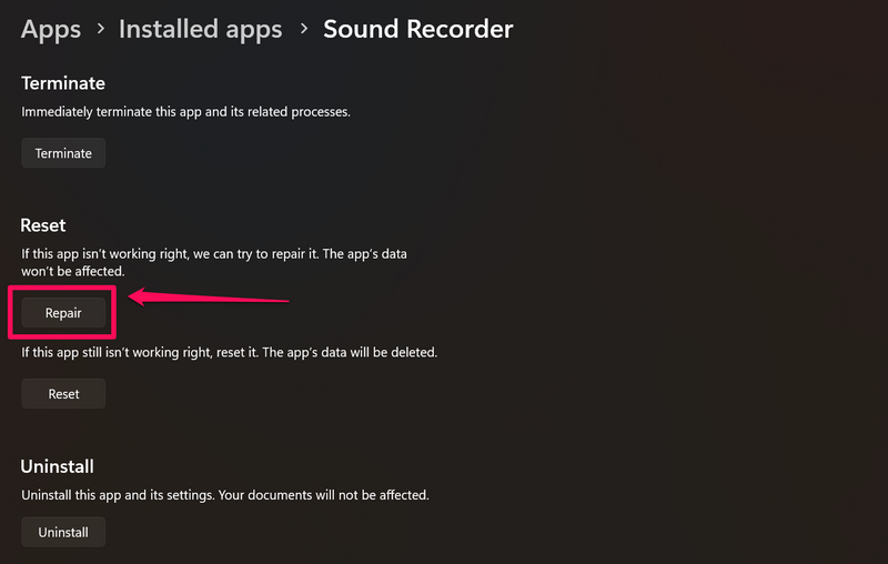 Ora, se stai utilizzando l'app Registratore di suoni di Windows integrata per registrare la tua voce e stai riscontrando un problema di mancato funzionamento del registratore vocale in Windows 11, puoi provare a riparare o ripristinare l'applicazione sul tuo dispositivo.