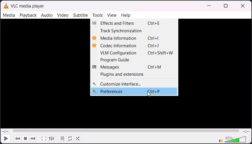 Avvia l'app VLC Player sul tuo PC Windows 11. Tocca l'opzione Strumenti situata nella barra dei menu in alto e seleziona "Preferenze".