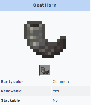 Con l'aggiornamento 1.19, tuttavia, le capre occasionalmente lasciano cadere le corna quando colpiscono blocchi solidi. Anche questi corni non sono puramente decorativi, poiché puoi suonarli per riprodurre un suono unico.