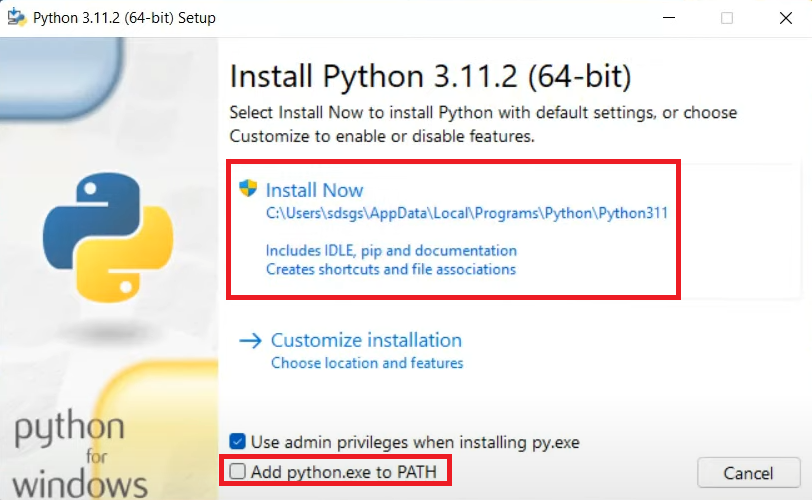 2.Nella home page, selezionaAggiungi python.exe al PERCORSOopzione e fare clic suInstalla orapulsante.
